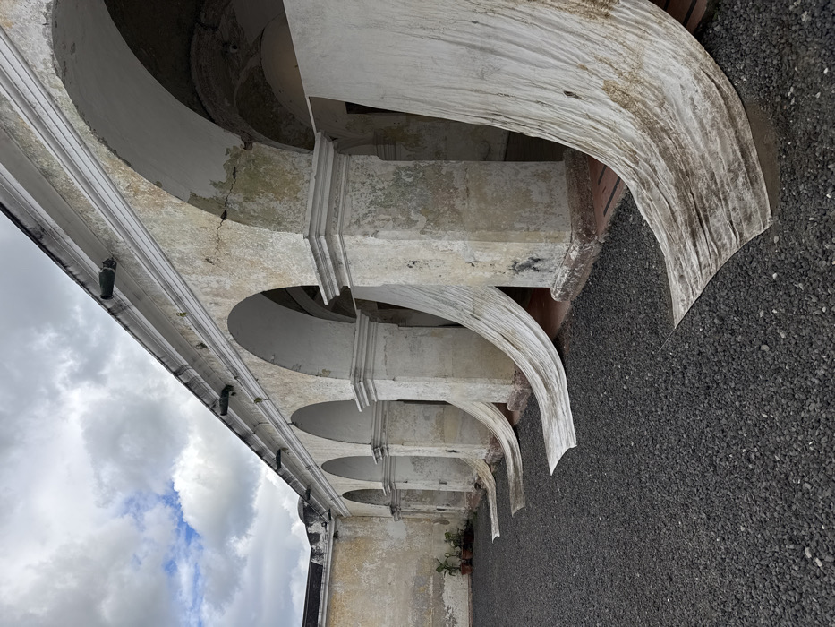 A low-angle, tilted view shows a colonnade with white stone arches supported by square columns. The stone is weathered, with peeling paint and visible cracks. Above the arches is a cornice with evenly spaced decorative fixtures. The sky with cloudy patches is visible to the left, while a gravel ground surface is seen on the right. A few small potted plants sit at the base of one of the columns.
