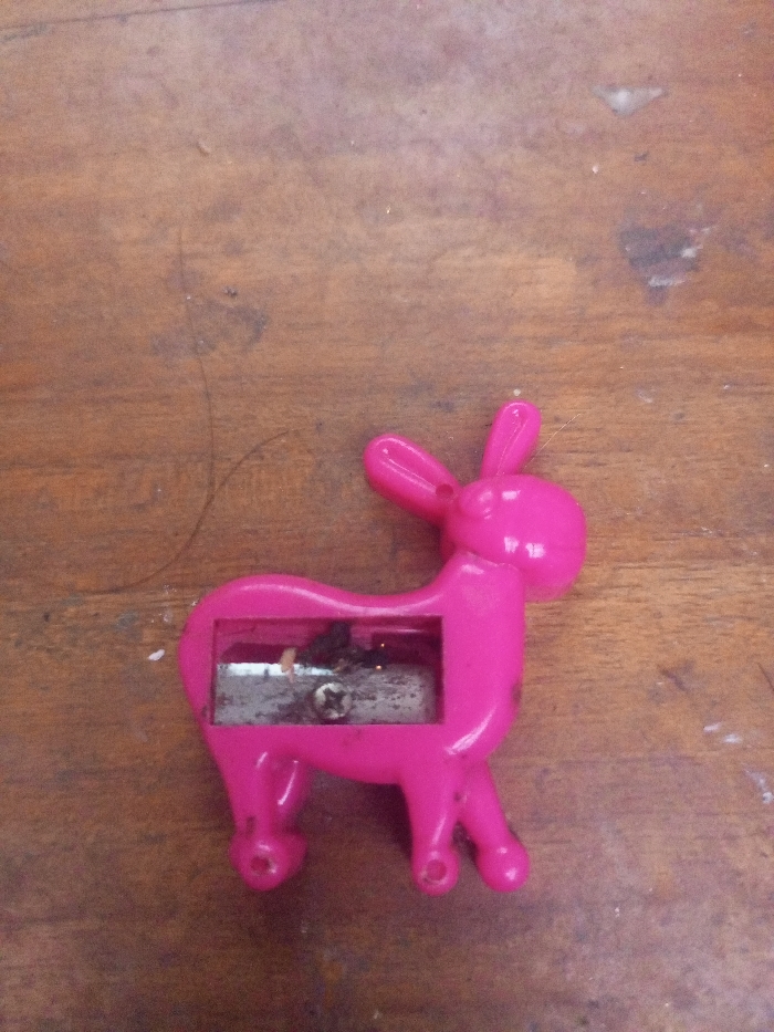 - "A pink plastic pencil sharpener, shaped like a stylized rabbit or donkey with four legs and two prominent ears, rests on a distressed brown wooden surface" by FM-44KR02, licensed under CC BY 4.0