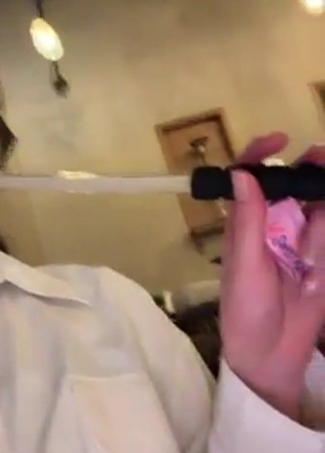 A woman with blonde hair and wearing a white button-down shirt is smoking from a hookah