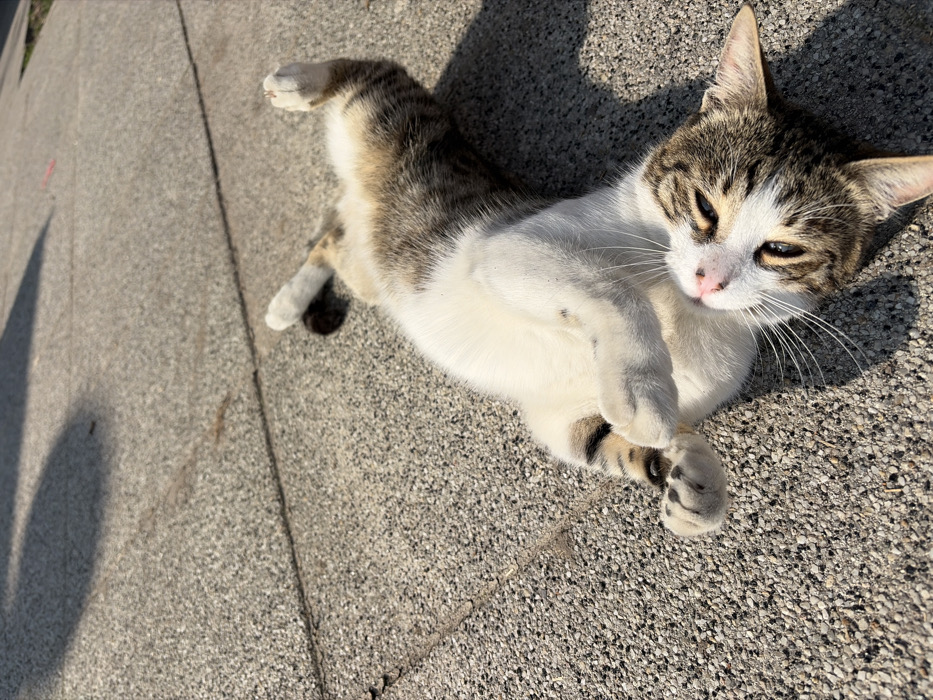 - "A domestic cat, exhibiting tabby markings with brown and grey stripes on its back and head, and a white underside, chest, and paws, is observed lying on its back on a light grey, granular concrete or asphalt surface" by FM-vetpu1, licensed under CC BY 4.0