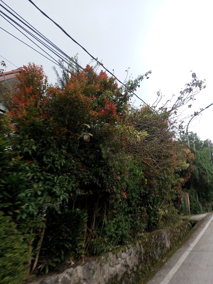 The image captures an outdoor street scene in Sandamal Eliya, Sri Lanka, under an overcast sky. The upper third of the frame consists of a light gray sky crossed by five parallel black utility lines extending diagonally from the upper-left to the upper-right. Below the utility lines, a portion of a building with a reddish-brown tiled roof is visible on the far left. The left and central areas of the image are dominated by dense, multi-layered vegetation. This includes bushes with dark green foliage and prominent clusters of bright reddish-orange leaves. A pale, spherical fruit-like object is visible hanging within the greenery at mid-left, and several small purple flowers are scattered among the foliage in the upper-center. Towards the right, a slender, light-colored pole, possibly a streetlight, emerges from the vegetation. The lower third of the image features a low retaining wall built from dark, moss-covered stones, running horizontally. To the right of this wall, a narrow drainage channel precedes a paved road that extends from the lower-right foreground towards the upper-right background. No individuals or animals are present.