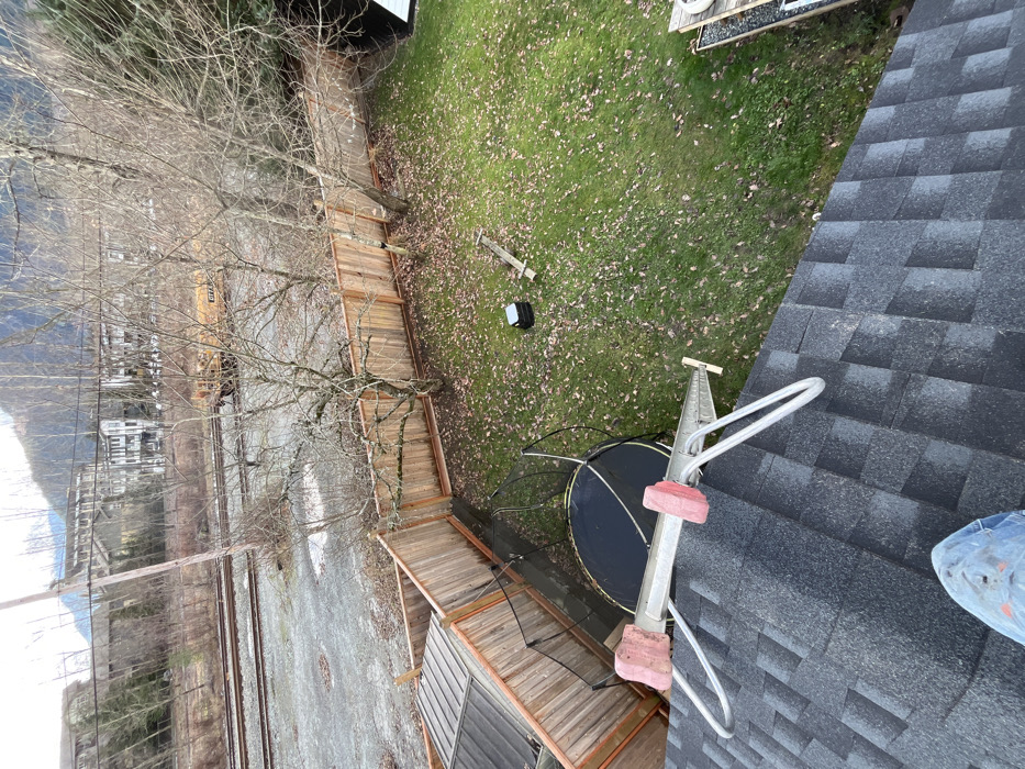 A rooftop view features a trampoline and a ladder secured with pink padding against asphalt shingles. Adjacent to the roof is a grassy area with fallen leaves and a black object. A wooden fence lines the property, alongside a tree with bare branches. Beyond the fence, train tracks run parallel to a road with buildings in the distance. A mountain is barely visible on the far left.
