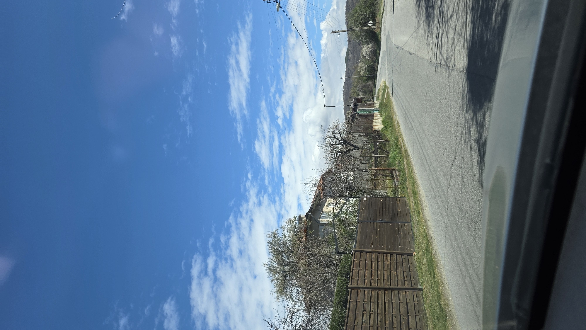 view of a residential area, likely in Slatino, Bulgaria. A paved road runs along the right side of the frame, with a dark shadow partially obscuring its surface. A wooden fence lines the road, with trees and vegetation growing behind it. A house is visible behind the fence, and a mountain range or hill is in the distance. The sky is blue with scattered white clouds. The photograph appears to have been taken from inside a vehicle.