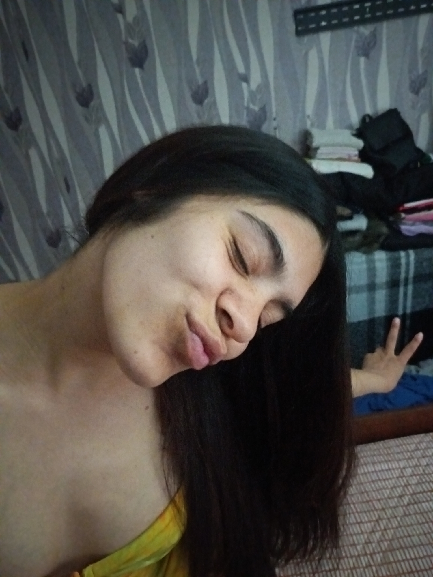 An indoor close-up depicts a female individual with long dark hair, her head tilted to the right. Her eyes are closed or heavily squinted, and her lips are pursed in a pouting expression. Freckles are visible on her nose and cheek. She wears a yellow garment, partially visible on the lower left. In the mid-right background, a left hand displays a peace sign. The background wall features wallpaper with vertical wavy grey stripes and darker leaf-like motifs. A dark, rectangular, slatted object is mounted high on the wall. To the right of the individual, a stack of folded light-colored fabrics and a dark backpack are visible, resting on a surface covered by a grey and black plaid blanket. Blue fabric is present beneath the blanket, and a woven mat texture is visible in the lower right foreground. The specific location within Roman, Bulgaria is not discernible from the visual information.