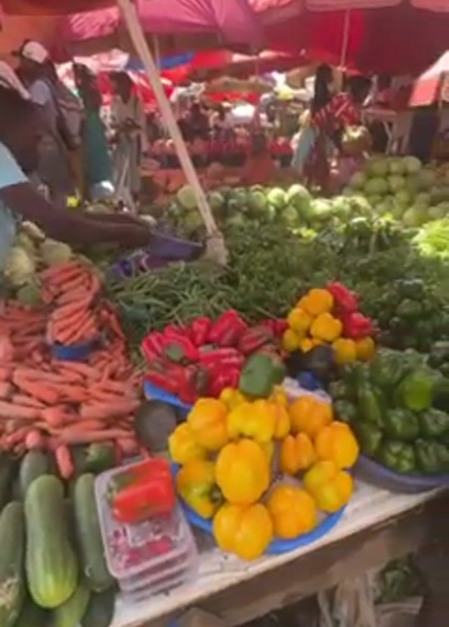 The video showcases a vibrant outdoor market scene, teeming with people and colorful produce displayed under a series of red and white umbrellas. The foreground is dominated by a stall laden with fresh vegetables, including carrots, zucchini, green beans, and an array of bell peppers in red, yellow, and green. Behind the stall, the market extends further with numerous vendors and customers engaging in transactions. The atmosphere appears bustling, suggesting a lively marketplace environment.