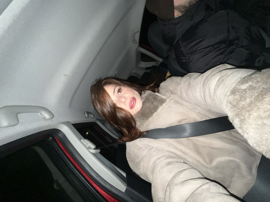 In a dimly lit car interior, a woman with shoulder-length brown hair and red lipstick poses, wearing a beige shearling-lined jacket and seatbelt. A dark-haired person in a black coat sits in the backseat behind her. The car's ceiling is light gray, and a grab handle is visible. The image is taken at an angle, offering a view of the car's interior, window frame, and seatbelt mechanism.
