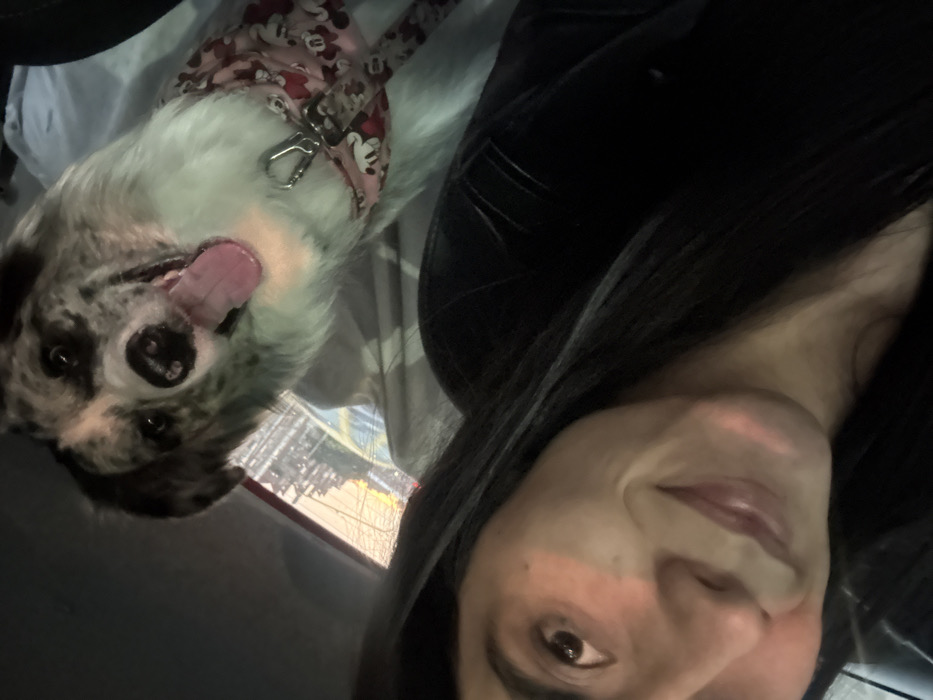 - "The image depicts a vertical, eye-level selfie taken inside a vehicle at night, featuring a human female and a dog" by FM-dYjX22, licensed under CC BY 4.0