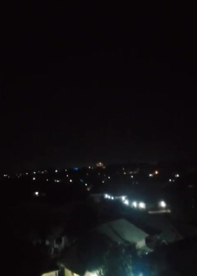 n exterior night scene of a city, with lit windows and streetlights. In the distance, fireworks are set off. The camera zooms in slightly on the fireworks. The video is shot from a high angle, possibly from a building or an elevated position. There are sounds of celebration or festivity in the background.