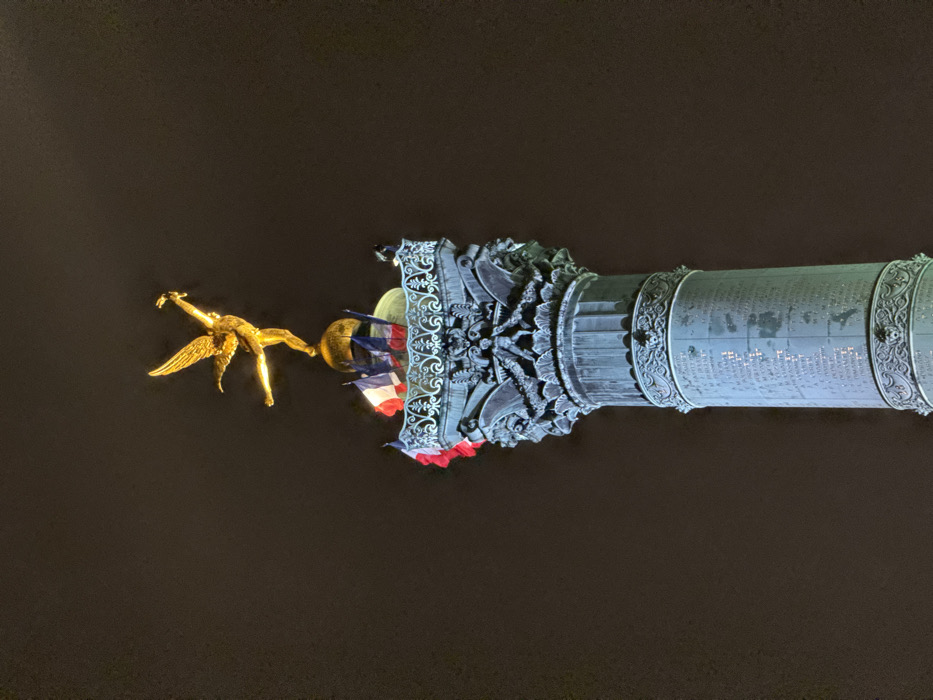 A nighttime image depicts the upper section of the Colonne de Juillet (July Column) at Place de la Bastille in Paris, France