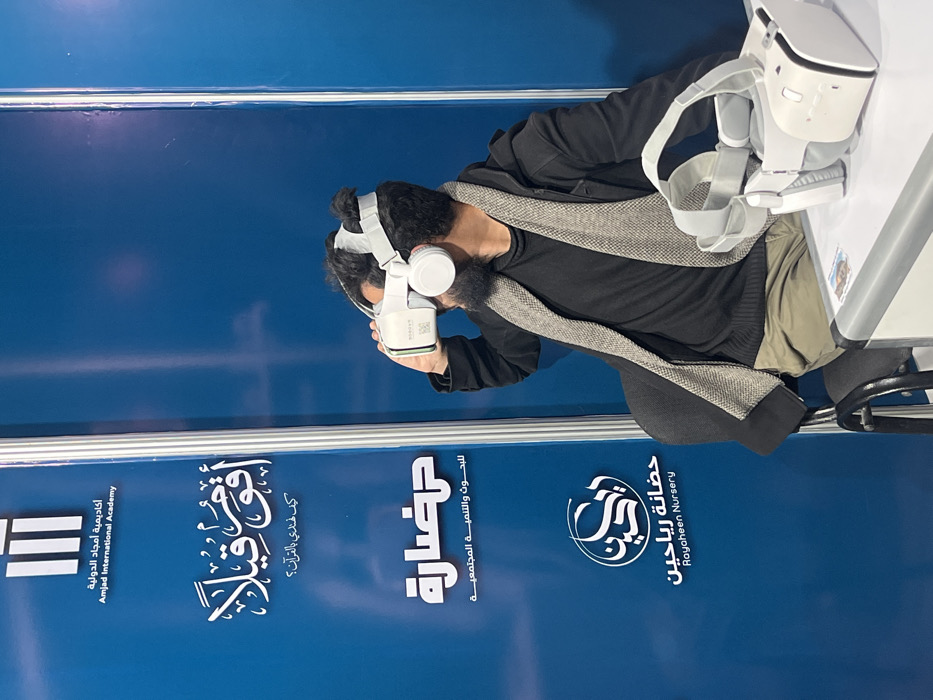 - "A person wearing a VR headset is seen against a blue backdrop with Arabic text" by FM-WnN6r1, licensed under CC BY 4.0