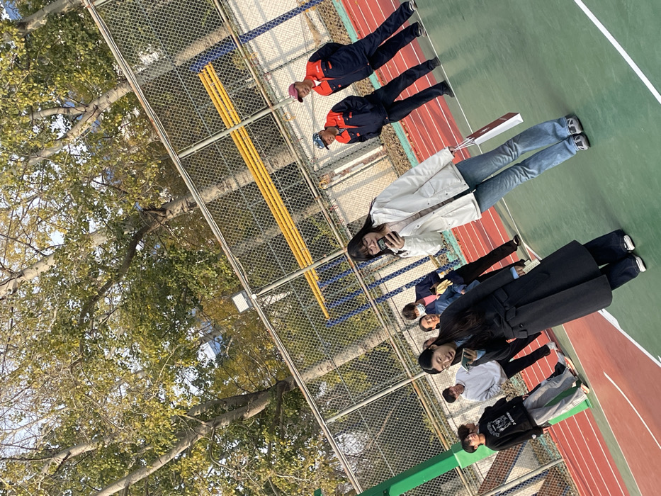 A group of people stand on a running track next to a fence. Two men wear work uniforms. A woman in a white coat holds a phone. Another woman wears a long black coat. Two other people stand in front of her, and a person in a black hoodie stands in the front. A tree's branches extend into the frame on the left.