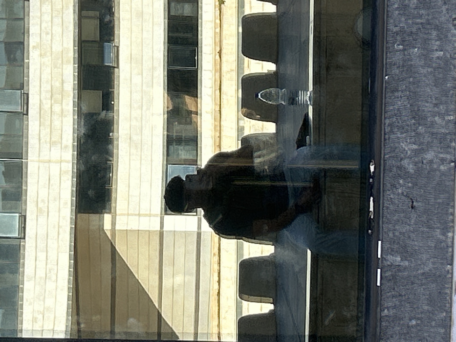 The image depicts a scene in Jibb as-Safa, Syria, viewed through a reflective window. The foreground shows a dark, textured window sill or frame, upon which small white objects, resembling cigarette butts or debris, are scattered. Reflected in the window, a dark-silhouetted individual is seated, facing the viewer. The person wears a dark cap, a dark short-sleeved shirt, and light-colored trousers. They are holding a smartphone in front of their face, appearing to take a photograph or selfie. An interior space is also reflected, featuring a dark, rectangular table with several dark, high-backed chairs positioned around it. A plastic water bottle with a blue cap stands upright on the table to the right of the reflected individual. Another dark, rectangular object lies flat on the table nearby. Beyond the reflection, through the window, a light-colored, multi-story building with numerous rectangular windows is visible under clear daylight. A distinct diagonal shadow from an unseen structure is cast across the building's facade.