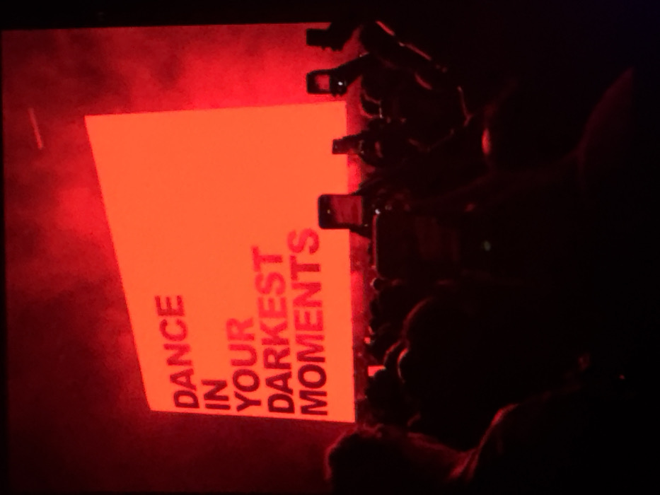 The image depicts an indoor event, likely a concert or performance, under heavy red illumination and a discernible atmospheric haze. A large, rectangular screen occupies the upper half of the frame, displaying the text "DANCE IN YOUR DARKEST MOMENTS" in dark, capitalized sans-serif characters against a bright orange-red background. Below the screen, a dense, silhouetted audience is observed. Multiple individuals in the crowd are holding smartphones upward, their displays faintly visible, suggesting active recording or photography of the stage. The precise location within Chișinău, Moldova, cannot be determined from the visual evidence.