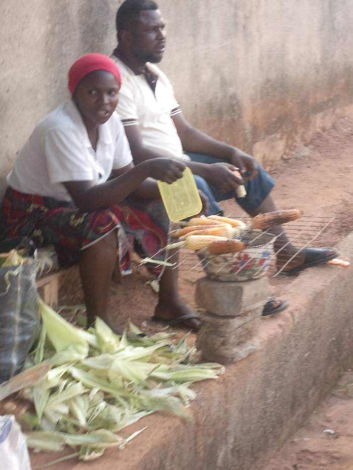 The image captures an outdoor scene in Akwanga, Nigeria, centered on an informal corn roasting operation