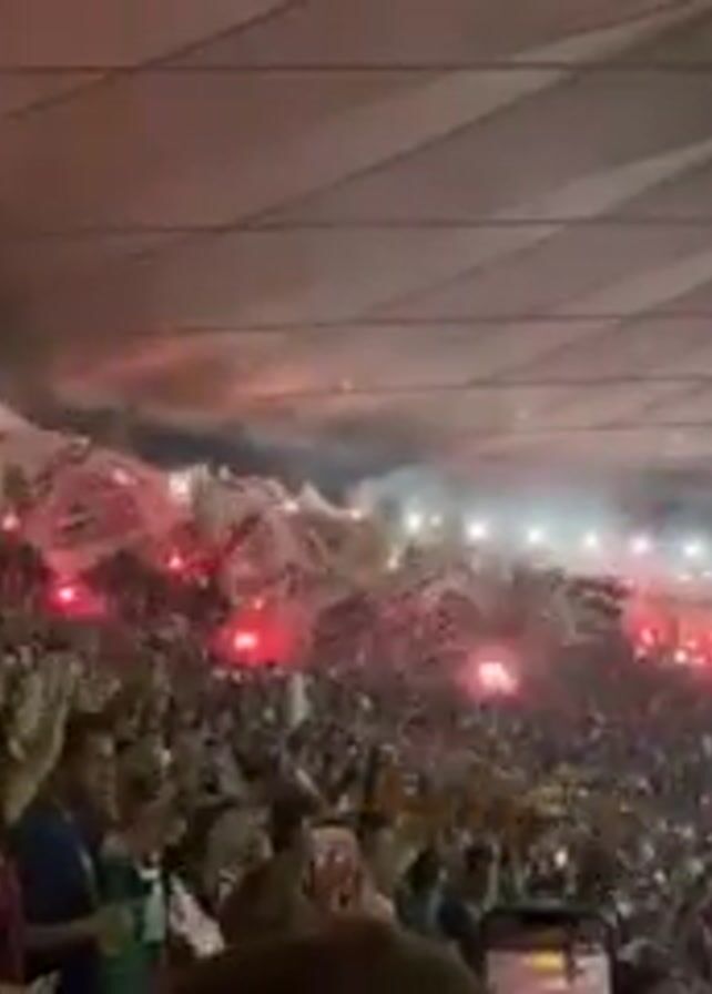 A large crowd of people cheers enthusiastically in a packed stadium, many of them waving white flags and holding up glowing red flares. Smoke fills the air above the crowd. The camera pans slightly to the right, revealing the stadium’s roof and a large screen displaying a soccer game. A person in the foreground holds up a white cup.