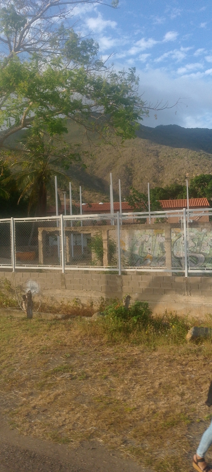 This image depicts an outdoor scene in Juan Griego, Venezuela, under natural daylight. The foreground consists of dry, sparse grass and dirt. On the far right, the lower legs and feet of an individual are visible, clad in light blue trousers and brown open-toed footwear, suggesting movement. The midground features a perimeter barrier composed of a concrete block wall, approximately 1.5 meters high, topped with white metal posts supporting a chain-link fence. Behind this barrier, a concrete structure, appearing unfinished or in disrepair, is visible, with multiple openings resembling windows or doorways. The concrete wall sections display multi-colored graffiti, primarily in green, yellow, and white tones. The background reveals several buildings with terracotta-colored tiled roofs, partially obscured by green foliage, including a prominent palm tree on the left. Multiple white, vertical poles, consistent with construction supports or utility infrastructure, are positioned between the fence and these buildings. Dominating the distant background is a large, arid mountain covered in sparse, light brown vegetation. The sky above is blue with scattered white clouds.