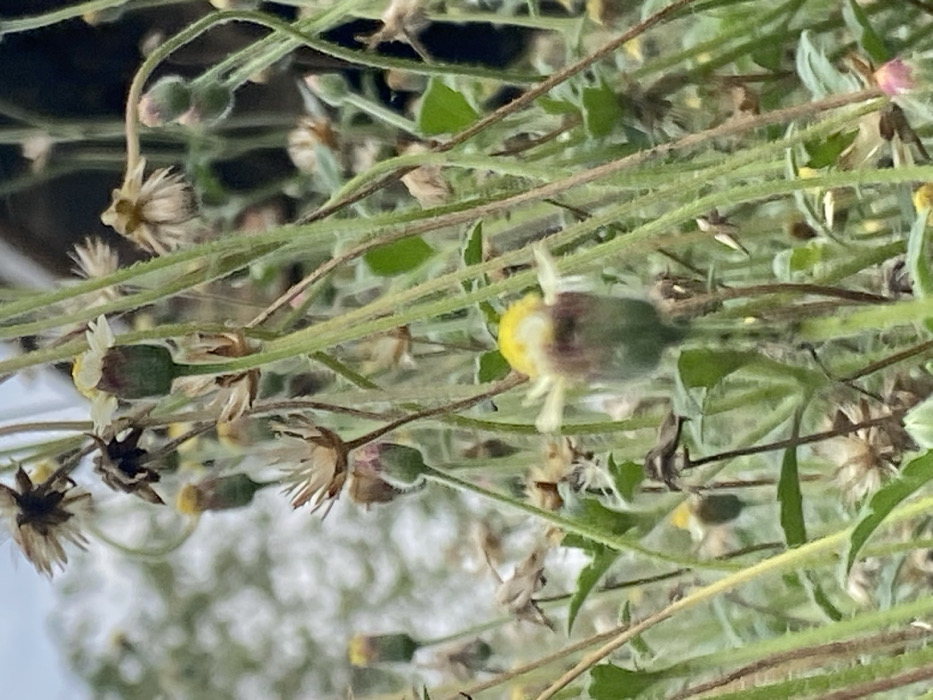The image presents a close-up, ground-level view of a dense cluster of flowering herbaceous plants, consistent with wildflowers or weeds, situated in an outdoor environment in Achara, Nigeria. The central foreground features a prominent, blurred floral structure with a distinct yellow, dome-shaped apex and a greenish-purple, bulbous base. Surrounding this are numerous slender, green stems, some exhibiting reddish-brown coloration, along with small green leaves. Multiple other flower heads are visible throughout the frame, predominantly in various stages of senescence, characterized by withered white or light brown ray florets and exposed central disks, some retaining residual yellow pigmentation. The background is out of focus, appearing as a diffuse light-toned area consistent with distant foliage or an overcast sky. No human figures, animals, or artificial structures are discernible within the frame. The precise micro-location within Achara is not identifiable from the visual evidence.