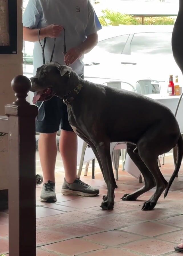 large, grey Great Dane dog on a leash, inside what appears to be the entrance or patio area of an outdoor restaurant. A man in a light blue t-shirt and dark shorts stands next to the dog, holding the leash. The dog sits and looks up at the man. Another person, wearing a black t-shirt and black pants, is standing on the right side of the frame, partially cut off by a serving cart. The floor is tiled with red bricks, and there's a dark railing on the left with white flowers on it. In the background, there are white tables and chairs, palm trees, and a white car parked outside. A menu board is affixed to the wall on the left of the frame.