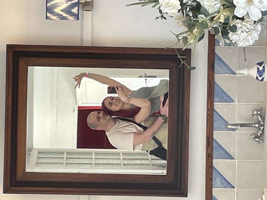 An image taken in Bunyola, Spain, captures a mirror selfie of two individuals. The scene is set in what appears to be a bathroom or private residence. A large, rectangular mirror with a dark brown wooden frame dominates the center, reflecting the subjects and their immediate background. Reflected in the mirror are a female and a male. The female, positioned in front, has long reddish hair, wears eyeglasses, and a light-colored, possibly grey-green, sleeveless top. She holds a dark-colored smartphone in her right hand, taking the photograph, and her left arm is raised with fingers splayed, revealing a light-colored wristband. Her right hand is placed on the male's waist. She is smiling. The male, standing behind the female, is bald and wears a light-colored short-sleeved t-shirt with a dark cross-body strap. A watch is visible on his left wrist. His right arm is wrapped around the female's waist. He is looking towards her. The reflected background behind them includes a white room, with an open white-framed window or doorway on the left revealing a red interior space or wall. Below the mirror, a tiled countertop features white tiles with blue triangular patterns. A silver-toned faucet with two handles is centered on the counter. To the right of the faucet, a white and blue patterned ceramic dispenser is visible. To the far right of the image, outside the mirror's reflection, a bouquet of white flowers (including hydrangeas and magnolia-like blossoms) with green foliage is partially present. Above the mirror and to the right, a wall-mounted light fixture with a blue and white patterned lampshade is visible. A wooden trim runs horizontally along the wall between the tiled counter and the bottom of the mirror frame. The surrounding walls are white.