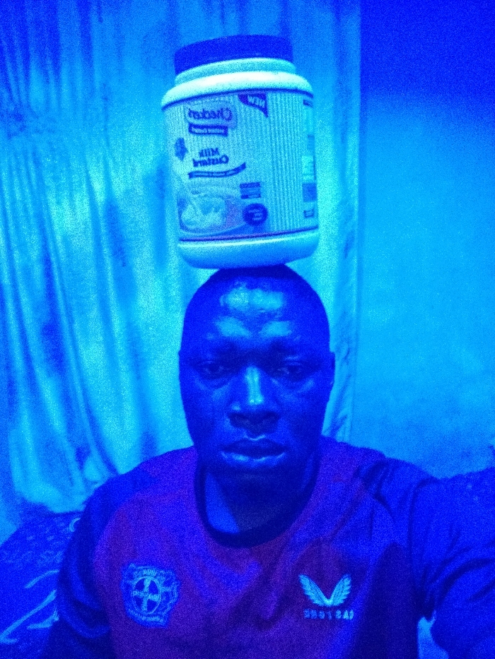 A man balances a container on his head. He looks directly at the camera, his expression neutral. He wears a red and black jersey. The container appears to be labeled "Chelsea Milk." The background is a blurry blue, possibly a wall or curtain. The photo is bathed in a strong blue light.
