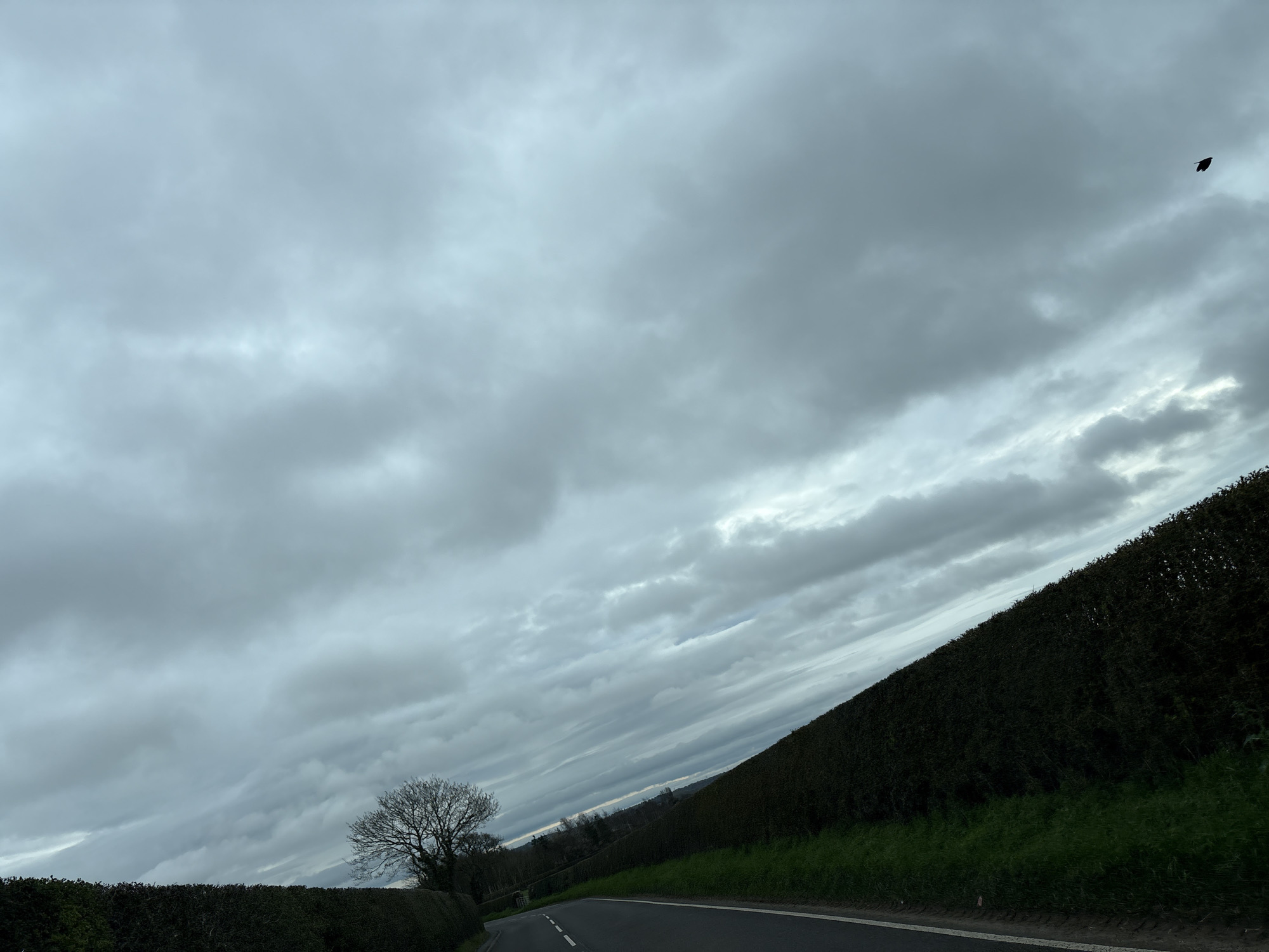 The image depicts a rural road scene under an overcast sky in Baschurch, United Kingdom. A dark asphalt road, marked with a white broken center line and a white solid edge line on the right, curves gently into the distance from the lower center. To the left of the road, a dense green hedge borders the carriageway, behind which a bare deciduous tree with visible branches stands against the sky. Further in the background on the left, additional trees and fields are faintly discernible under the cloudy horizon. To the immediate right of the road, a narrow strip of green grass and weeds precedes a very tall, dense dark green hedge that extends upwards and into the distance, almost entirely obscuring the background on that side. The sky occupies approximately the upper two-thirds of the frame, filled with various shades of grey, heavily clustered clouds. A small, dark, indistinct object, possibly a bird or airborne debris, is visible in the upper right portion of the sky. No individuals or active subjects are present in the frame. The overall lighting is diffused and flat, characteristic of heavy cloud cover.