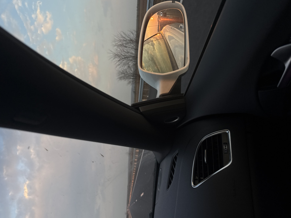 A forensic examination of the image reveals a scene captured from within a moving vehicle on a multi-lane highway in Chokoba, Bulgaria, at either sunrise or sunset. The sky displays a gradient of light blue, pink, and orange hues with scattered clouds. The forward view through the windshield shows a wet asphalt highway extending into the distance, marked by dashed white lane lines. Multiple small specks and streaks, consistent with dirt or insect residue, are present on the windshield. A metal guardrail runs parallel to the right side of the highway. Beyond the guardrail, sparse, bare trees stand against a flat landscape. The vehicle's dark-colored dashboard occupies the lower-left foreground, featuring a chrome-trimmed air vent with horizontal slats and an "AIRBAG" label above it. The dark passenger-side A-pillar is prominent in the midground, partially obscuring the view. To the right, a white passenger-side exterior mirror reflects a strong orange glow from the sun, the wet road surface, and the rear quarter panel of the vehicle. Within the mirror's reflection, illumination from vehicle lights or streetlights is visible on the damp road surface, along with at least one other white vehicle ahead. No individuals are depicted in the scene.