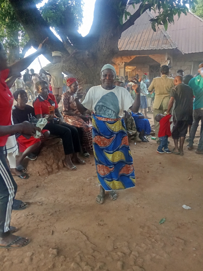 A group of people gather outdoors, with a large tree providing shade. The focal point is a woman wearing a white t-shirt with a portrait and a vibrant blue and orange patterned wrap. She is gesturing with both hands, seemingly in the midst of a lively dance or celebration. Others sit or stand around, some watching, with a building visible in the background. The ground appears to be dirt or packed earth. The atmosphere is lively and festive.