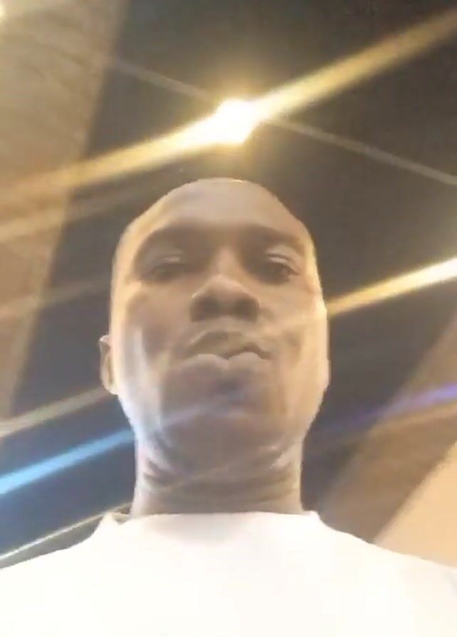 A man with a shaved head, wearing a white t-shirt, is recording a selfie video. He's outside at night, with bright lights in the background. He looks straight into the camera and moves his lips.