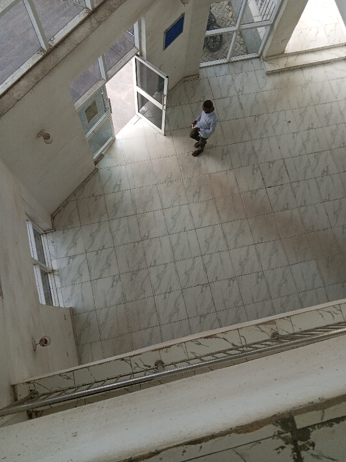 The image displays the ground-level interior of a building in Lokoja, Nigeria, viewed from an elevated perspective