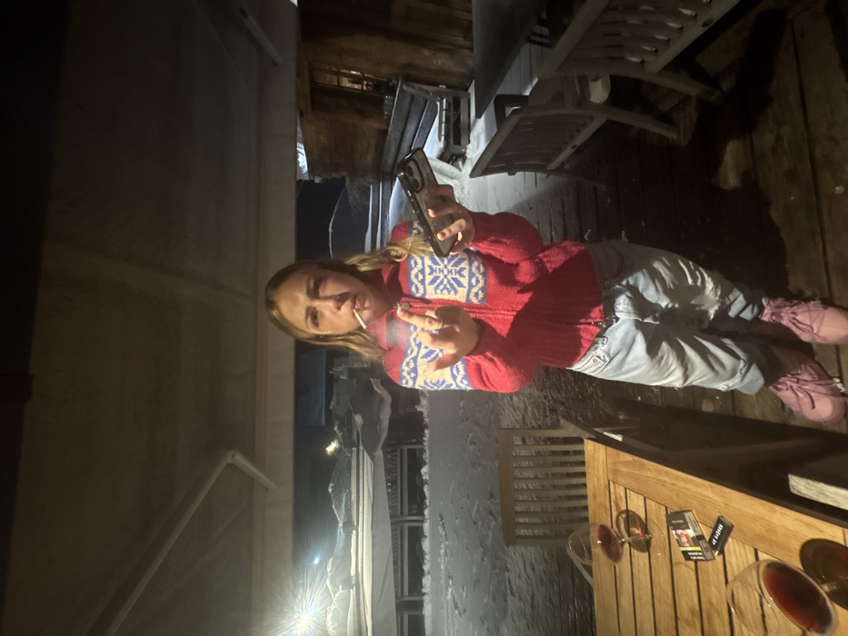 A young female stands outdoors on a wooden deck or terrace at night, in what appears to be a snowy environment, likely in La Clusaz, France