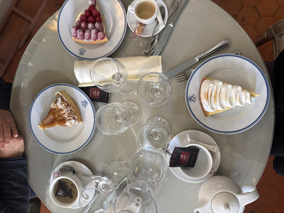 This image captures an overhead view of a circular table set for several patrons in a cafe or patisserie in Aix-en-Provence, France