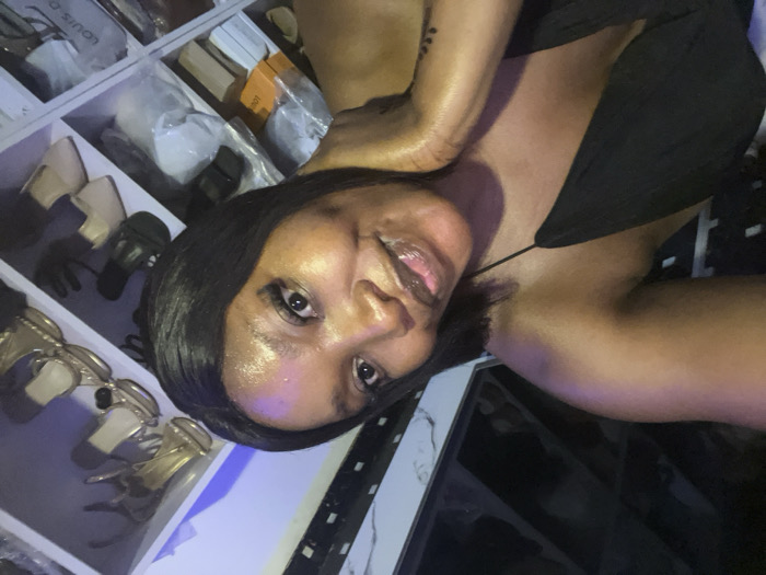 A woman with sleek, dark hair poses in a black top, her arm raised behind her head. She has full lips and dark eyes. Behind her is a white cabinet filled with various shoes, including sandals and heels. The cabinet also holds boxes and bags, some with visible branding. The background includes a marble-patterned surface. The lighting is dim, creating shadows and highlights on the woman's skin.