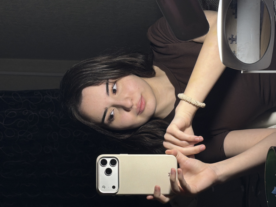 The image depicts a single female individual in an indoor, dimly lit environment. The location as Saratov, Russia, cannot be determined from the visual evidence. The subject is a young adult female with dark brown hair, fair skin, and dark eyes. She is wearing a dark brown, short-sleeved t-shirt. A light-colored, possibly braided bracelet, is present on her left wrist. Her gaze is directed towards her right (viewer's left), with a neutral expression. She is holding a light gold-colored smartphone vertically in her left hand, with her right hand resting on her left forearm. The phone is fitted with a light gold case featuring a visible 'M' logo near the bottom and houses a three-lens camera array and a flash module on its rear. In the lower right foreground, a portion of a dark-colored desk lamp, possibly black, with a rectangular head, is visible. Below the lamp, a light-colored object with a reflective surface, possibly a mirror or a glossy screen, shows a faint reflection of what appears to be puzzle pieces. A dark green bowl with a white rim is partially visible in the lower left foreground. The background is dark. On the left, a dark curtain or fabric with a subtle swirling pattern is visible. The wall on the right is plain and dark. The primary illumination appears to originate from a light source positioned to the subject's front and slightly to her right, highlighting her face and the phone.