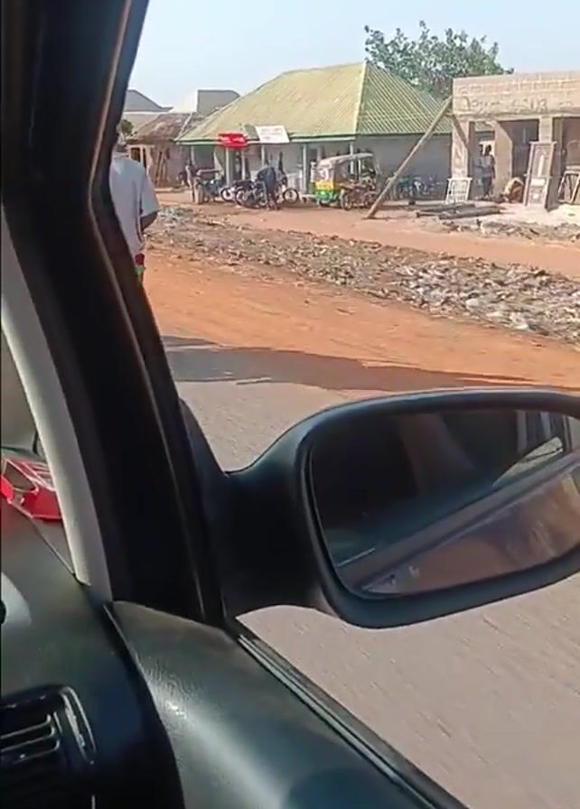 The video is shot from inside a car, focusing on the side view mirror and the view outside the passenger side window. The car is moving through what appears to be a rural or semi-rural area with unpaved, reddish-brown dirt roads. The weather is sunny and clear. Visible outside the car are various buildings, mostly single-story, with different roofing styles and colors. Some appear to be shops or commercial spaces, while others seem residential. There is some litter and debris along the roadside in certain areas. The camera captures motorcycles and pedestrians. People are seen walking and riding on the side of the road. The side view mirror reflects the passing scenery, providing a glimpse of the road behind the car and some of the surrounding environment. The dashboard and interior of the car are visible. Audio of music plays.
