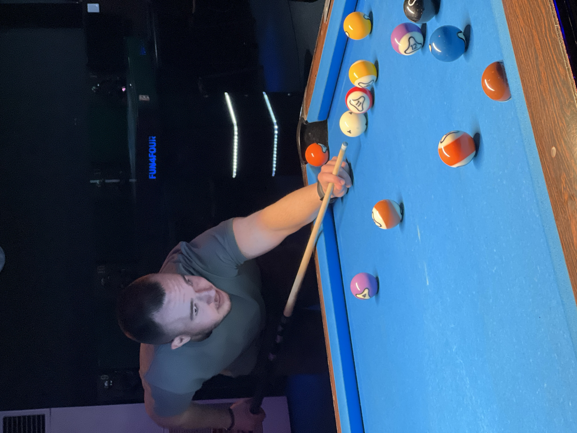 The image depicts an indoor billiards scene in the city of Yambol, Bulgaria. A male individual, appearing to be in his 20s or 30s, with short dark hair, is shown leaning over a pool table. He wears a dark olive green short-sleeved t-shirt and dark trousers. A dark wristband is visible on his left wrist. The subject is in the process of aiming a shot, with his right hand holding the butt of a light-colored wooden pool cue and his left hand forming a bridge on the table's felt surface to guide the cue shaft. His gaze is directed downwards, focused on the pool balls. The pool table has a light blue felt playing surface and dark wooden rails. Multiple pool balls are arranged on the table: a pink ball marked with a '4', an orange striped ball, a white ball with an abstract symbol, a red striped ball with an abstract symbol, two yellow balls with abstract symbols, a purple ball with an abstract symbol, a black ball marked with a '15', and a solid blue ball. An orange ball is partially lodged in a table pocket in the lower right corner. The cue ball is visible near the center-right of the frame. The background is dimly lit. To the far left, a portion of a light-colored vertical structure with a dark vent is visible. In the right background, two horizontal lines of illuminated white LED lights are visible against a dark wall. Below these lights, the blue illuminated text "FUN4FOUR" appears on a dark surface.