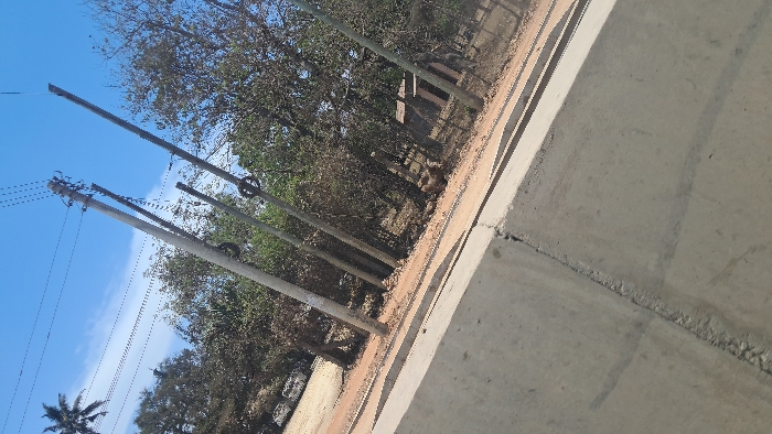 The image displays an outdoor scene in Shanzu ward, Kenya, characterized by a bright blue sky with sparse white clouds. The lower foreground is occupied by a light grey concrete barrier running diagonally from the bottom-left to the middle-right. Immediately behind this barrier is a reddish-brown dirt expanse, suggesting an unpaved road shoulder or pathway. Embedded in this dirt area are at least four tall, slender utility poles, appearing to be concrete, supporting multiple overhead wires and insulators. Dense green and brown foliage, comprised of various trees and shrubs, forms a substantial part of the midground and background, partially obscuring a distant view. A partial palm tree frond is visible against the sky in the upper-left quadrant. To the far left, a light-colored vehicle is partially visible on a dirt patch. Further in the background, a small, rustic, single-story structure with a dark roof is partially discernible amidst the trees. No human figures are present. The scene is illuminated by direct sunlight, casting subtle shadows.