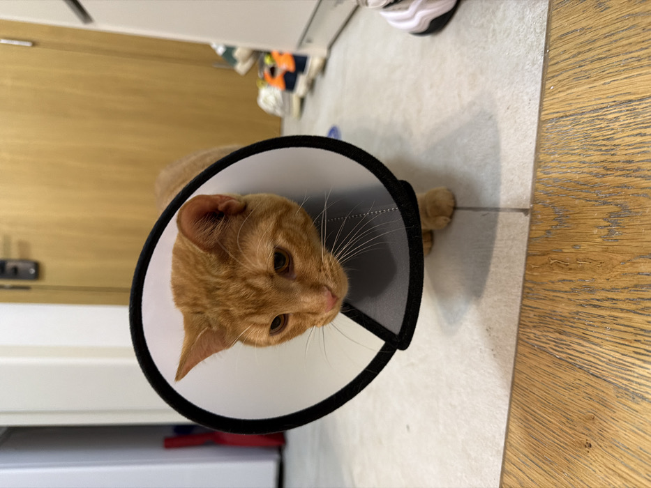 - "An orange tabby cat wears a cone of shame, standing on a tiled floor beside hardwood flooring" by FM-GuW672, licensed under CC BY 4.0