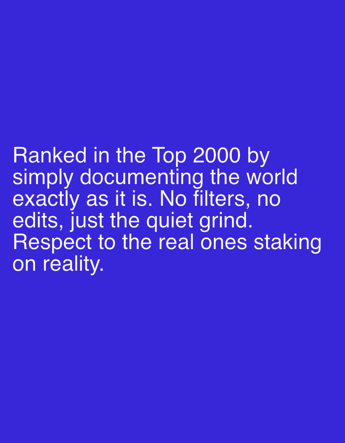 The image displays white text on a solid, vibrant blue background. The text reads: "Ranked in the Top 2000 by simply documenting the world exactly as it is. No filters, no edits, just the quiet grind. Respect to the real ones staking on reality." There are no discernible people, subjects, objects, actions, interactions, or environmental features present in the image, making it impossible to identify a specific location, including any part of the city of Burgas, Bulgaria.