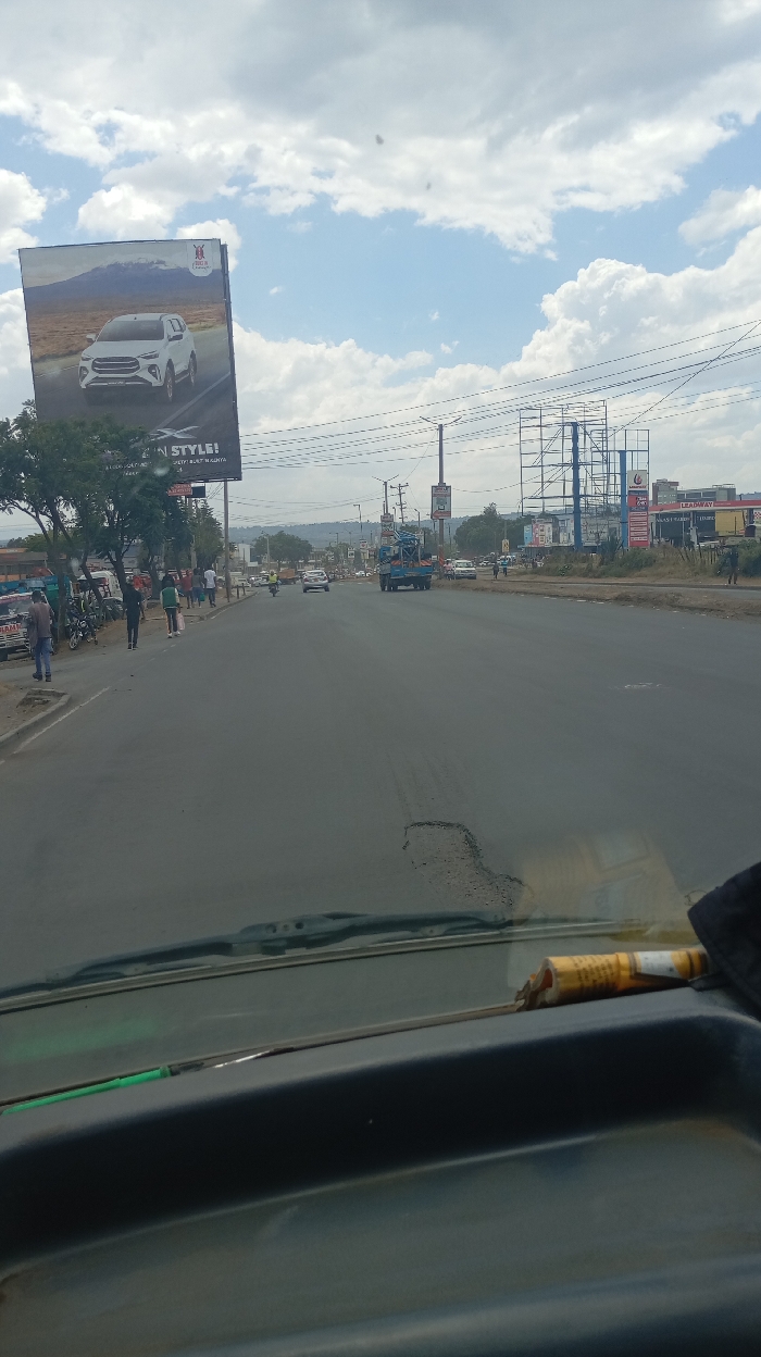 A straight road stretches into the distance under a cloudy sky. On the left, a large billboard displays a white SUV. People walk along the sidewalk. On the right, multiple smaller billboards are visible. A utility truck and other vehicles populate the road. The view is from inside a vehicle, with the dashboard and a half-eaten snack bar visible in the foreground. A visible pothole is present in the road.