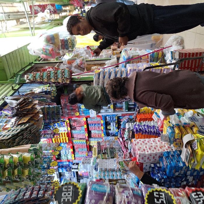 A vibrant store displays colorful merchandise. Three people are seen browsing or working. A man in black uses a red tool near a shelf, while two others wearing jackets examine the items. Various products, including wrapped bundles, packs of tissues, and candy, fill the shelves, with price tags visible in the foreground. The scene captures a bustling market atmosphere.