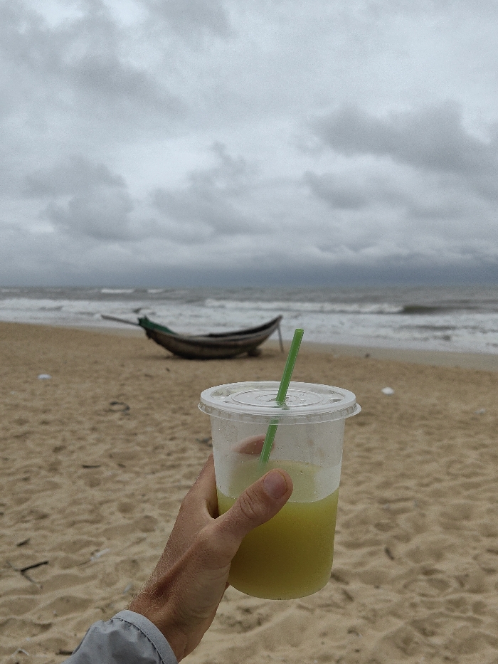 A human hand, consistent with male anatomy, is depicted in the foreground holding a clear plastic cup containing a translucent yellow-green liquid. A bright green plastic straw is inserted through the clear, domed lid of the cup. The cuff of a light grey garment is visible at the bottom left. The setting is a sandy beach, likely in Thuận An Ward, Vietnam. In the midground, a traditional, weathered wooden basket boat (thuyền thúng) with dark brown coloring and green netting draped over its side rests on the light brown sand. White-capped waves are breaking on the shore in the background. The horizon line is visible where the ocean meets a heavily overcast sky, characterized by dense grey clouds. The environment appears dim and muted due to the cloudy conditions.