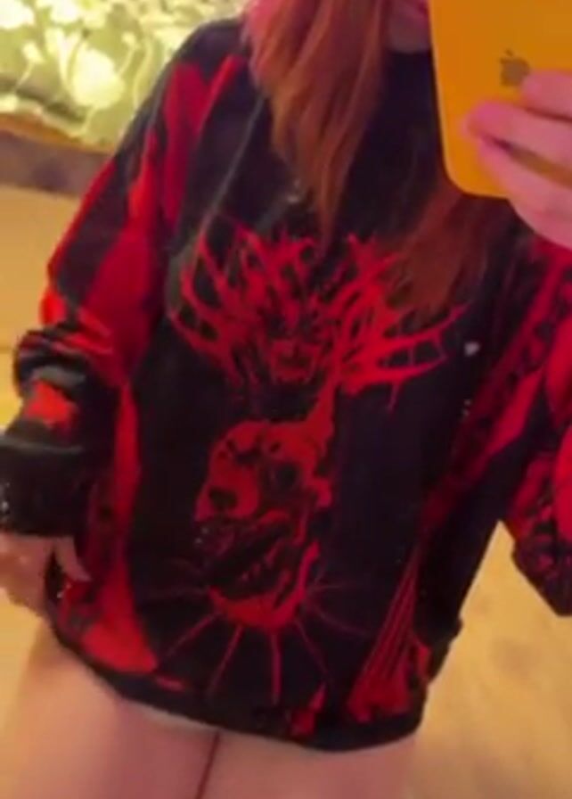A woman with red hair stands indoors, holding a yellow smartphone, presumably taking a selfie video. She's wearing a long, oversized black and red sweatshirt with a bold graphic design. The room has a wooden floor and a bed with patterned covers is visible in the background. She is looking at her phone screen, and her hands move slightly as she adjusts her hair. The lighting in the room is somewhat dim.