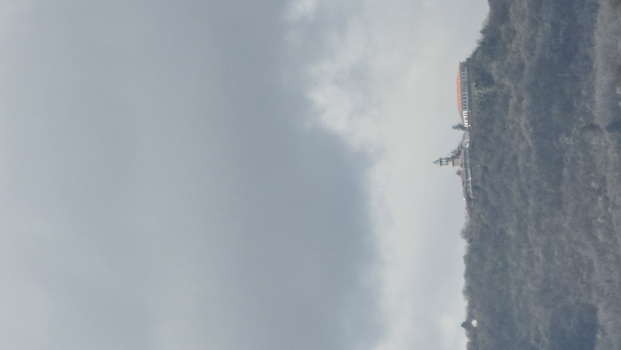The image depicts an elevated view of a hillside in Lyaskovets, Bulgaria, under an overcast sky. A section of the hill is covered with dense vegetation, potentially trees. On the hillside, a building with an orange roof and white exterior is visible, along with a church steeple. The sky dominates the left side of the image.
