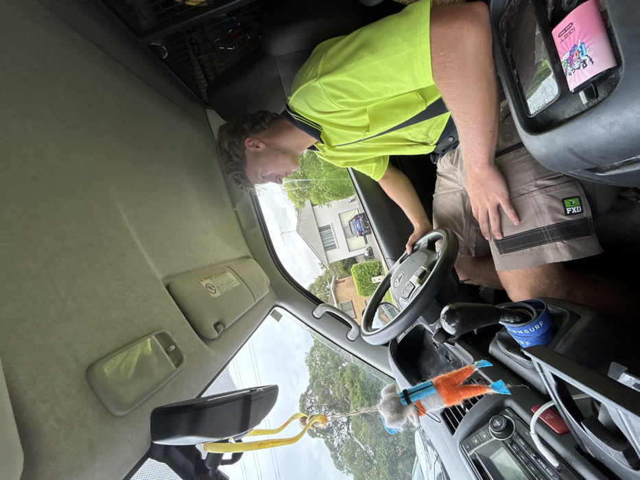 Inside a car, a fair-skinned person wearing a neon yellow work shirt and tan shorts with a dark stripe sits behind the steering wheel