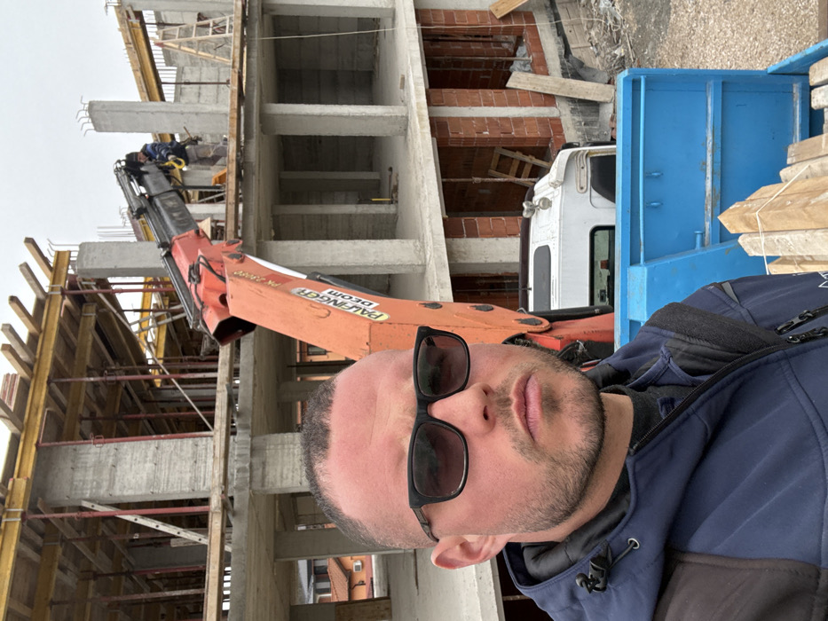 The image depicts an active construction site in the city of Haskovo, Bulgaria, under an overcast sky. In the foreground, a male individual is centered, positioned from the chest up, looking directly towards the camera. He has a shaved head with a slight stubble on his face and is wearing dark rectangular sunglasses. He is dressed in a dark blue softshell jacket with black accents, zippered pockets, and a visible black shoulder strap. To his immediate right, a portion of an orange and black Palfinger PK 28000 crane arm is prominent, mounted on the white cab of a truck, which is partially visible below the crane arm. The background is dominated by a multi-story building under construction, primarily composed of reinforced concrete columns and floor slabs. Multiple levels show exposed concrete structure, with wooden formwork and numerous steel adjustable props supporting the upper floor slabs. On the lower visible levels of the building, sections of red brickwork are integrated into the concrete frame, indicating wall construction. A second male individual, dressed in work clothing, is visible on an upper concrete slab, positioned near the articulated boom of the crane. A wooden ladder leans against a structural element on an upper floor. To the lower right, a blue-painted truck bed or container is visible, containing a stack of light-colored wooden planks or beams. Beyond the immediate construction site, fragments of residential buildings with terracotta roofs are discernible.
