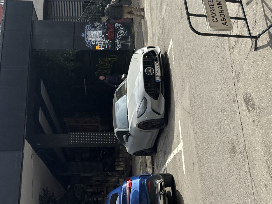 An outdoor scene in Sofia, Bulgaria, depicts a light grey Mercedes-Benz AMG GT sports car parked in a designated parking space, facing slightly left of the viewer