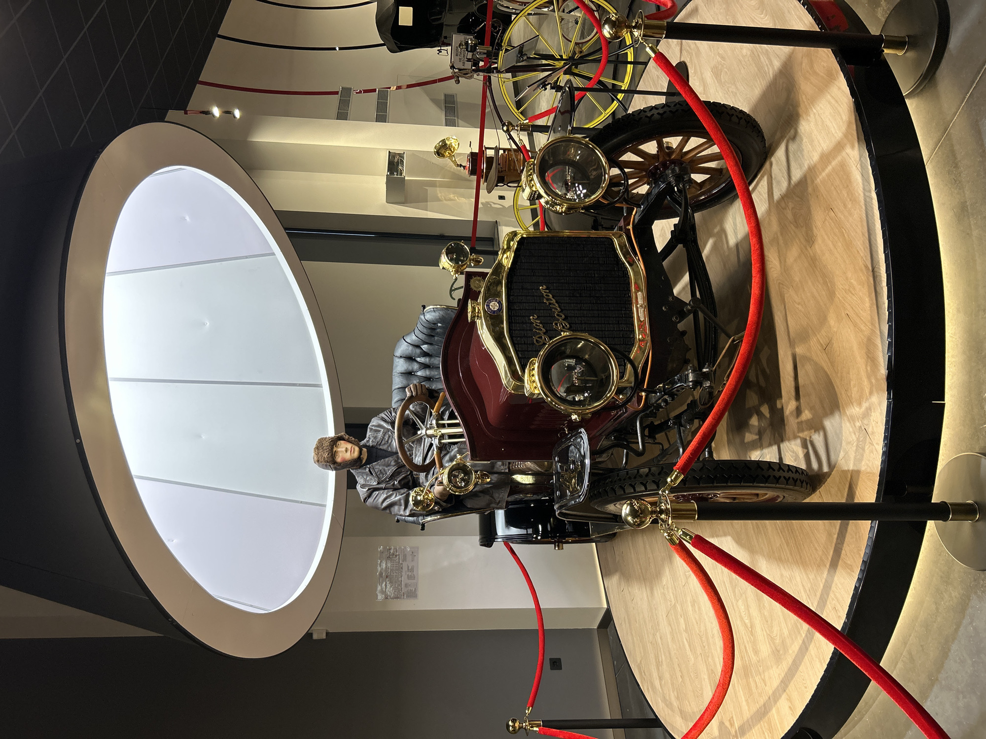 The image displays an indoor museum exhibition located in Markovo, Bulgaria. A vintage maroon and black automobile, bearing the inscription "Dion Bouton" on its brass-colored front grille, is centrally presented on a circular, illuminated wooden platform. The vehicle features two prominent circular headlights with brass-colored rims, smaller brass accents, black fenders, and wooden-spoked wheels fitted with black rubber tires. A full-sized mannequin, attired in a brown fur-lined cap, a dark leather-like long coat, and dark gloves, is positioned in the driver's seat, with its hands on the wooden steering wheel. Red velvet ropes strung between black and brass-colored stanchions encircle the display, maintaining a perimeter. In the background, to the right of the main exhibit, another older vehicle with large yellow-spoked wheels is partially visible, also cordoned off by red ropes, alongside a gramophone with a gold horn situated on a pedestal. The interior environment features white and gray walls, a dark ceiling with a large circular overhead light fixture, and vertical black and red design elements on the right wall. An informational plaque is affixed to a wall behind the mannequin.