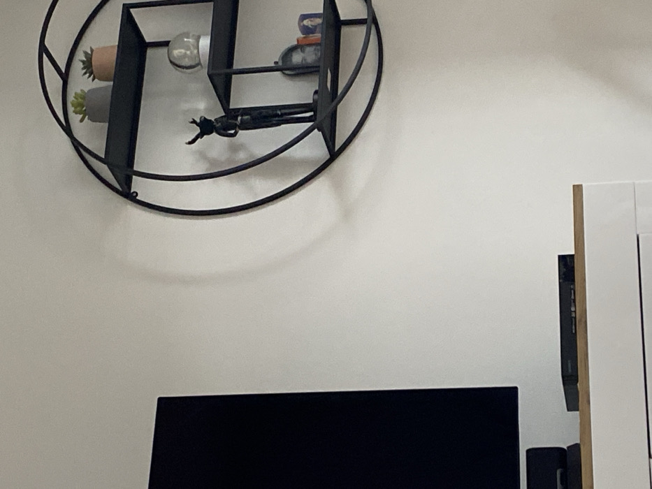 The image depicts an indoor scene, described as being in Täby, Sweden. The prominent features include a portion of a wall-mounted or freestanding black television screen on the left, partially obscured. Below the television, a white cabinet with a wooden top surface holds a black electronic device, possibly a media player or set-top box. To the right, a black, circular, multi-tiered wall shelf is affixed to a plain white wall. The top shelf contains two small potted succulents, one in a gray pot and one in a terracotta-colored pot. The middle shelf displays a dark-colored figurine resembling a standing deer with antlers and, to its right, a clear globe-shaped decorative item. The bottom shelf holds two small framed objects or pictures, one appearing to be a portrait. No individuals are present, and no actions or interactions are depicted. The environment is uniformly lit, with subtle shadows visible from the circular shelf.