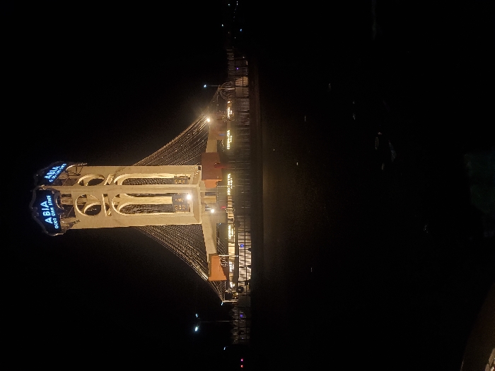 A nighttime shot shows a brightly lit structure with the name "ABIA" on top, reflected in water. The structure is supported by arched beams, with numerous lights stretching across the frame creating a fan-like effect. Dark water and a dark sky fill the background, contributing to the scene's contrast. The structure appears to be on a waterfront or pier, and is the main focal point, with the reflection adding a sense of depth.