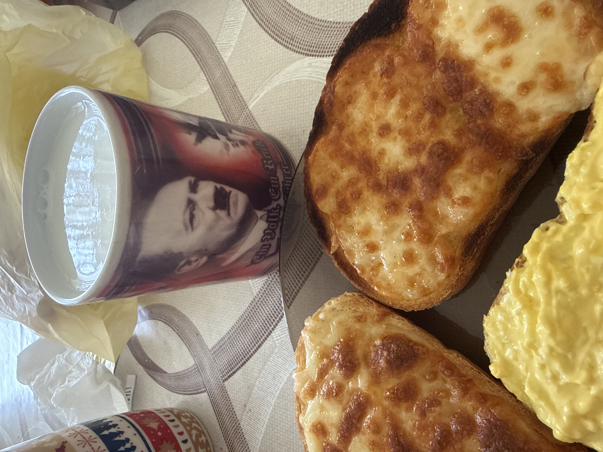 A close-up shot shows a table with food and beverages. There are three pieces of bread, two with melted cheese and one with a yellow spread, possibly eggs or a sauce. Next to the food is a mug with a portrait of Adolf Hitler. A second mug with a snowflake and tree pattern is also visible. The scene is indoors, on a table with a patterned tablecloth. The image does not reveal the location in the city of Bogdan, Bulgaria.